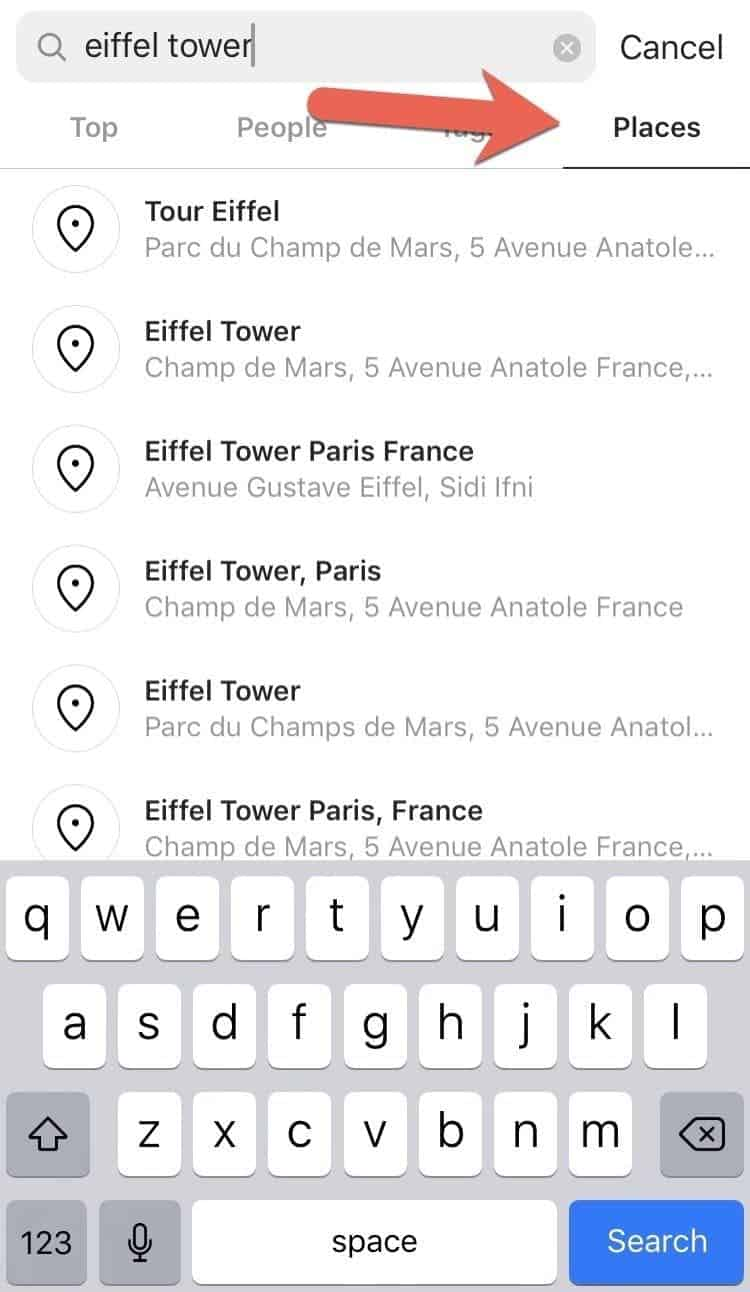 Start by typing in a random word or feeling in the search bar. Then, head over to the “Places” tab and scroll through the endless amount of locations to tag.